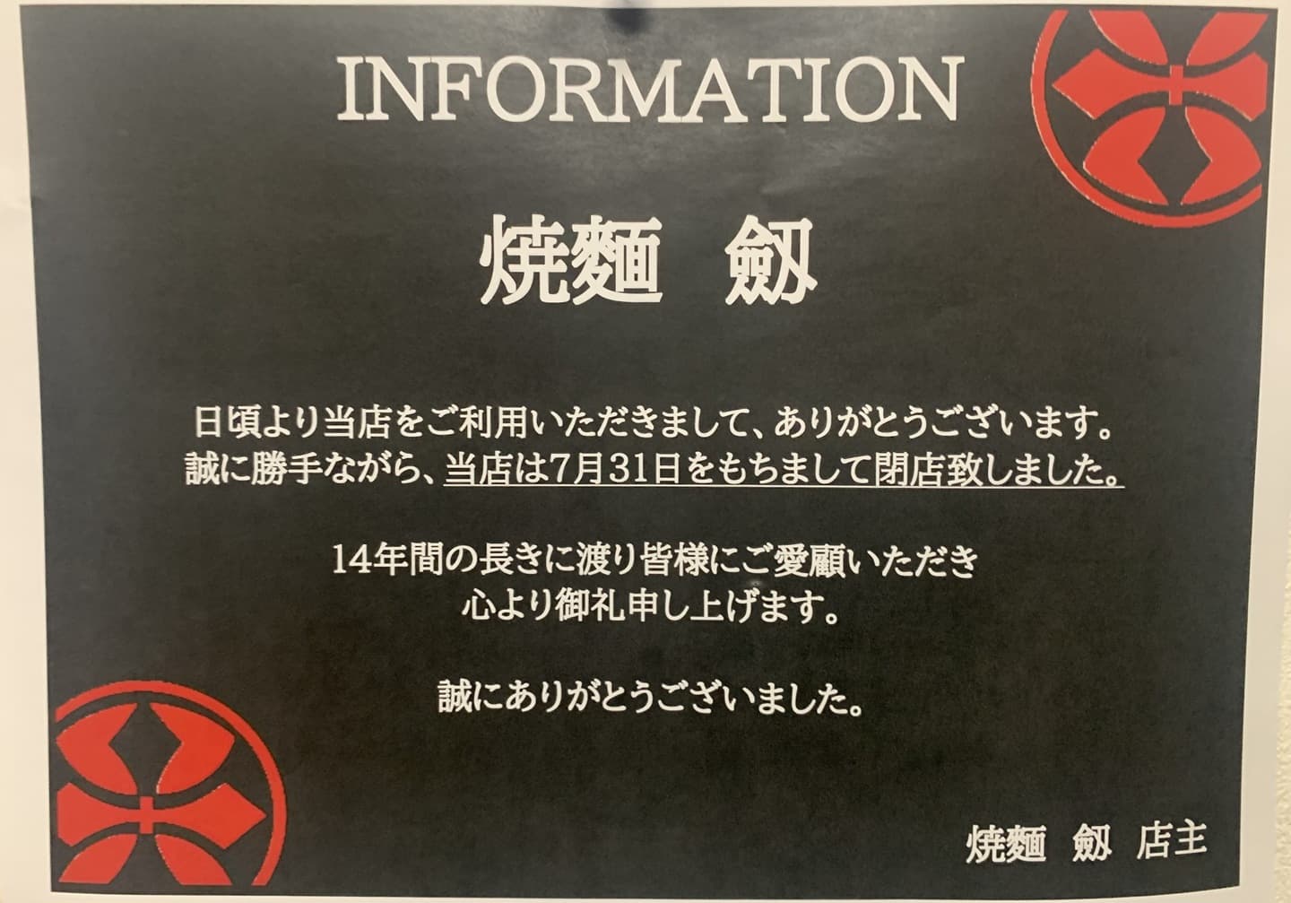 さて、突然ではございますが、諸般の事情により令和6年7月31日をもちまして「焼麺劔」を閉店する運びとなりました。